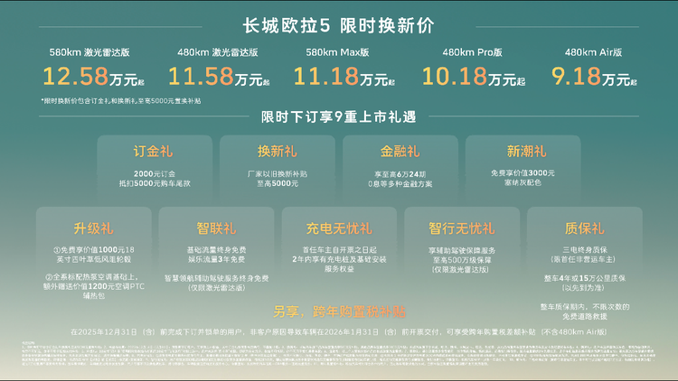 【中国·保定】2025年12月16日——今日,长城汽车欧拉品牌全新A级纯电SUV——长城欧拉5正式上市。新车共推出5款配置,建议零售价区间为 9.98万至13.38万元,限时换新价9.18万元起(限时换新价包含“订金礼”和“换新礼”至高5000元以旧换新补贴)。为回馈广大用户的热爱与支持,即日起至2025年12月31日,用户下订并锁单即可尊享包含订金礼、换新礼、智行无忧礼在内的9重上市好礼,以及跨年购置税补贴(不含480km Air版)等丰厚购车权益。凭借诚意十足的价格权益与越级产品力,长城欧拉5致力于成为全球年轻用户的“严选搭子”。