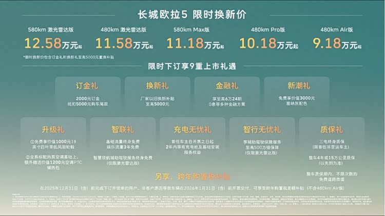 12月16日,长城汽车欧拉品牌全新A级纯电SUV——长城欧拉5正式上市。新车共推出5款配置,建议零售价区间为 9.98万至13.38万元,限时换新价9.18万元起(限时换新价包含“订金礼”和“换新礼”至高5000元以旧换新补贴)。凭借诚意十足的价格权益与越级产品力,长城欧拉5致力于成为全球年轻用户的“严选搭子”。