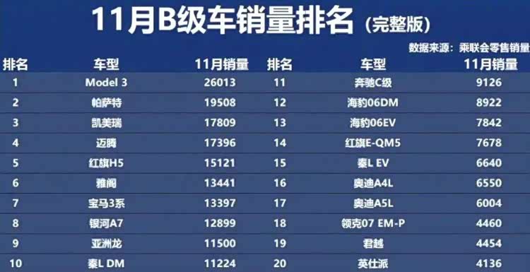 11月份,B级车市场呈现“燃油车大胜、新能源抢位”的鲜明格局,燃油车型依旧是主力军,整体销量占比超过六成;在所有车型中,上汽大众帕萨特位列第二,在燃油车细分市场中,妥妥还是销冠。