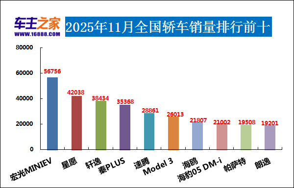 2025年11月轿车销量排行前十(单位:辆)