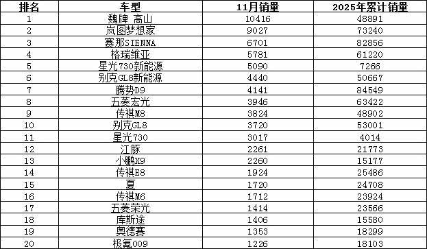 2025年11月MPV销量排行榜(单位:辆)