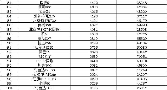 2025年11月SUV销量排行榜(单位:辆)