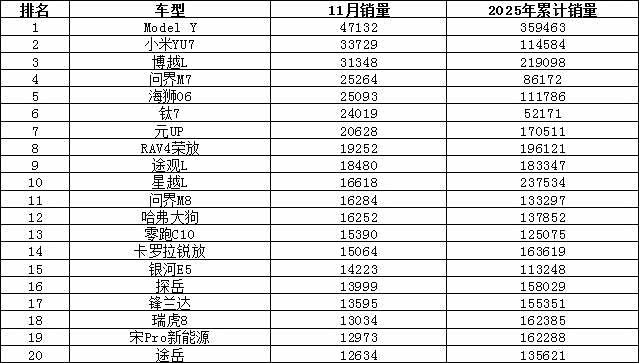 2025年11月汽车销量排行榜 鸿蒙智行上榜