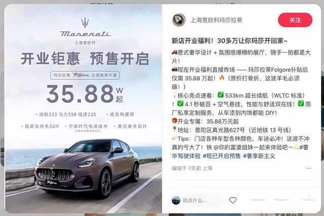 近日,一则关于玛莎拉蒂Grecale Folgore裸车起售价降至35.88万元的消息,在汽车圈引发了巨震。这个价格相较于其高达89.88万元的官方指导价,降幅超过了54万元,而这场源自经销商清库存的“跳水价”促销,竟意外地掀起了一波抢购潮,上海等地门店甚至出现了顾客排队的景象。不过在短暂消费热情背后却是以玛莎拉蒂为代表的外资豪华汽车品牌,在中国市场所面临的集体性困境,接下来我们就来深度分析一下这件事情背后的变局。