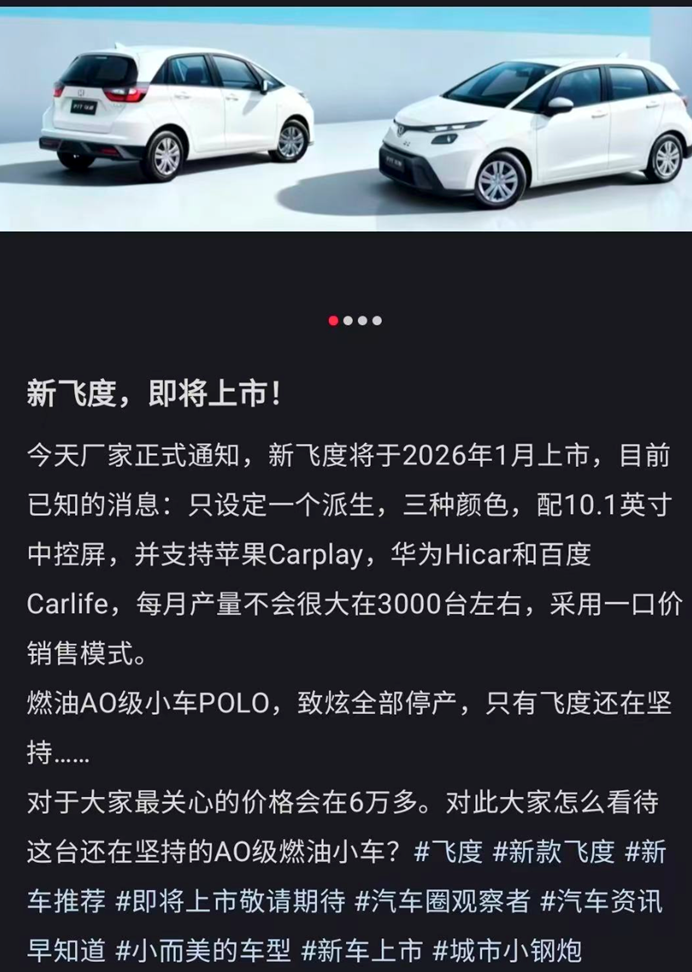 最近和几个老车友聊天,话题总绕不开那辆曾经满大街跑的“小 飞度(参数|询价)”。这车当年可是不少年轻人的第一台车,省油、好开、空间还大,改装圈里更是把它捧成“平民超跑”。可最近听说,2026年1月要上新款的飞度了,但看这俩月的销量数据——10月全国卖了3台,11月直接挂零,心里不禁犯嘀咕:这老伙计是要焕发第二春,还是真要被时代淘汰了?