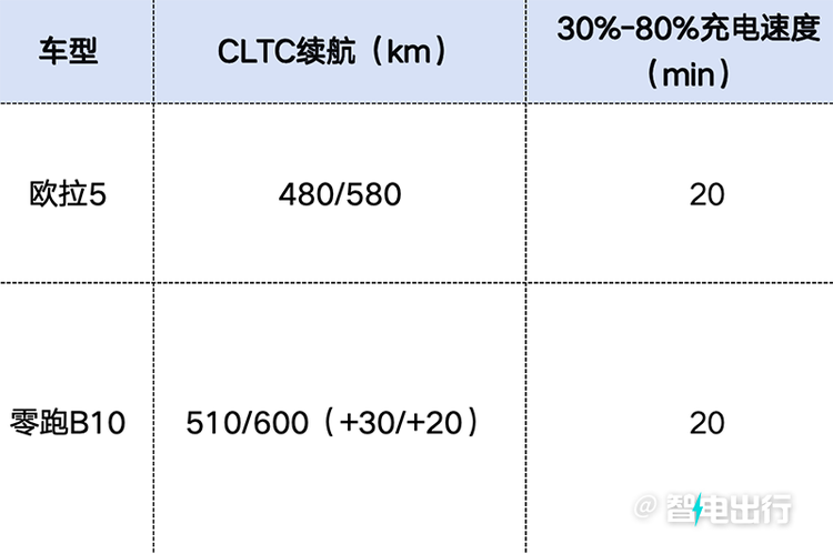 续航和补能效率两车相差不大。欧拉5采用的三元锂电池提供480km和580km两种CLTC续航,官方宣称30%-80%的快充20分钟。零跑B10基于800V高压平台,采用的磷酸铁锂电池能提供CLTC 510km和600km两种续航,官方宣称的30%-80%快充同为20分钟(小电池版19分钟)。