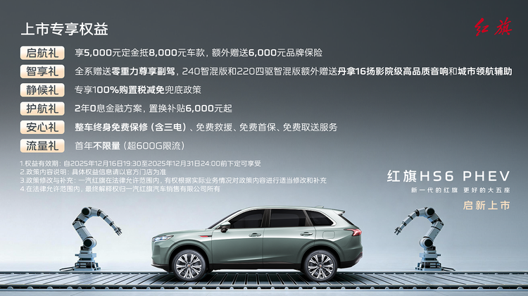 在上市期间,红旗HS6 PHEV推出了启航大礼、智享礼包、静候惊喜等多项上市福利,进一步减轻了家庭用户的购车负担。这一举措不仅展现了一汽红旗“为家庭造车”的深厚诚意,也彰显了其以卓越产品力直面市场竞争的坚定信心。