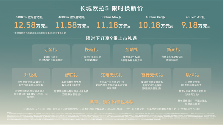 12 月 16 日,长城欧拉5 在保定正式上市,这是一款定位 A 级的纯电 SUV,共推出 5 个配置版本,官方指导价区间为 9.98–13.38 万元。同步公布的限时换新价从 9.18 万元起,活动持续至 2025 年 12 月 31 日,包含订金优惠和以旧换新补贴等权益。