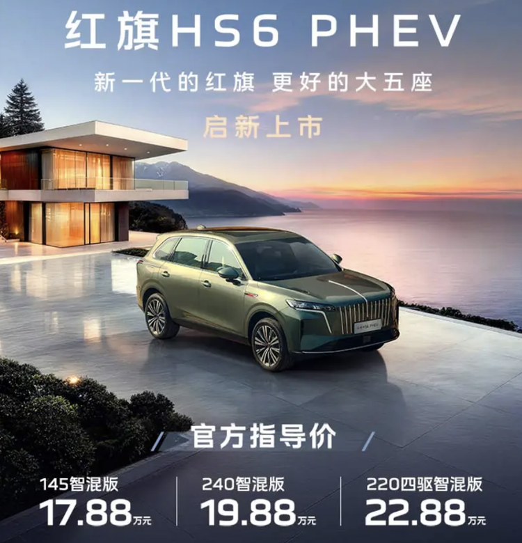 一汽红旗旗下全新中大型SUV车型—— 红旗HS6 PHEV(参数|询价)于12月16日正式上市,新车共推出3款配置车型,官方指导价区间17.88万元-22.88万元。新车延续家族式的外观设计,并且换装全新内饰设计语言,搭载1.5T插混系统,纯电续航最高可达240km。