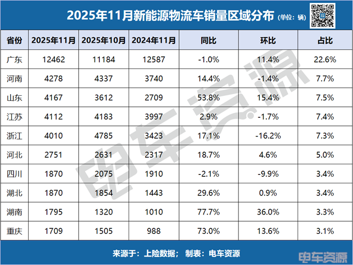 11月区域销量分布呈现鲜明的“核心引领、多点爆发”特征。广东省以12462辆的销量继续领跑全国,全国占比22.6%,作为物流枢纽和新能源政策高地,其市场渗透率已达较高水平。除广东外,河南(4278辆)、山东(4167辆)、江苏(4112辆)、浙江(4010辆)构成第二梯队,四省销量均突破4000辆,成为支撑市场的重要力量。