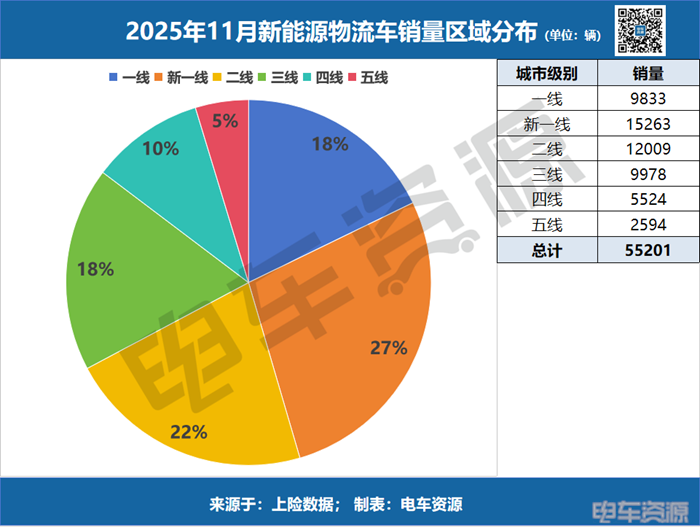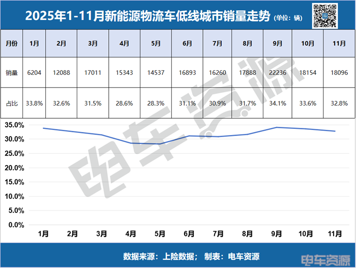 综合来看,低线城市已成为新能源物流车市场增长最稳定的基本盘。1-11月,其销量从1月的6204辆攀升至11月的18956辆,规模扩张超三倍,且月度销量占比始终稳固在30%以上,9月更达34.1%的峰值。这一持续而强劲的增长曲线,印证了市场下沉的确定性趋势——增量之战,已在广袤的下沉市场全面展开。
