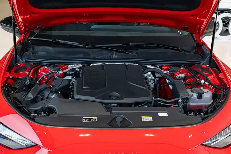 车辆内部装饰主要使用了红色的设计元素,如方向盘和座椅等,都是通过红色的缝线来描绘的。座椅采用了Microfiber超纤绒和Laedana超纤皮的双拼材料,车顶也同样使用了Microfiber超纤绒,并搭配了竞速碳纤维饰板,以增强内饰的质感和运动氛围。11.9英寸的液晶显示设备与14.5英寸的中央控制屏幕共同构成了一个曲面的双联屏,整个系列都默认配备了10.9英寸的副驾驶显示屏,并且支持无线CarPlay/Android Auto互联技术。从空间角度看,以小编1.8米的身高来看,坐在轿跑车型上时膝盖还能有两拳的余量,头部的空间也足以支撑大约一拳,这打破了轿跑车型“空间受限”的传统观念。此外,这款车还搭载了Bang&Olufsen 3D环绕音响系统、Bang&Olufsen的前端枕音响设备、光境氛围灯以及掀背式的后备箱。