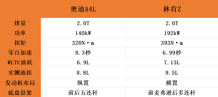 另外,值得一提的是,奥迪A4L发动机采用了纵置布局,底盘方面也是采用了前后五连杆式独立悬架,这一点比横置发动机布局以及采用前麦弗逊式独立悬架的林肯Z来的更高级。