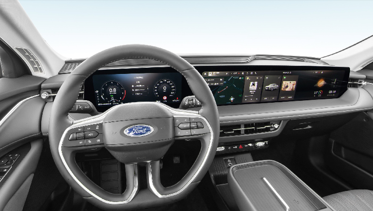 坐进车内,那1.1米长的27英寸4K贯穿屏(12.3英寸仪表+27英寸中控)直接霸占视线,高通骁龙8155芯片加持,新一代SYNC+系统响应飞快,支持四音区语音、大语言模型和VA 4.0助手,喊一句“我饿了”它就能推荐附近美食。空调区保留实体旋钮+按键,盲操友好;50W无线快充+多主题内饰(黑紫、浅灰可选),软质包裹摸着高级。高配B&O音响+氛围灯,天窗拉开听歌,车厢秒变移动演唱会。