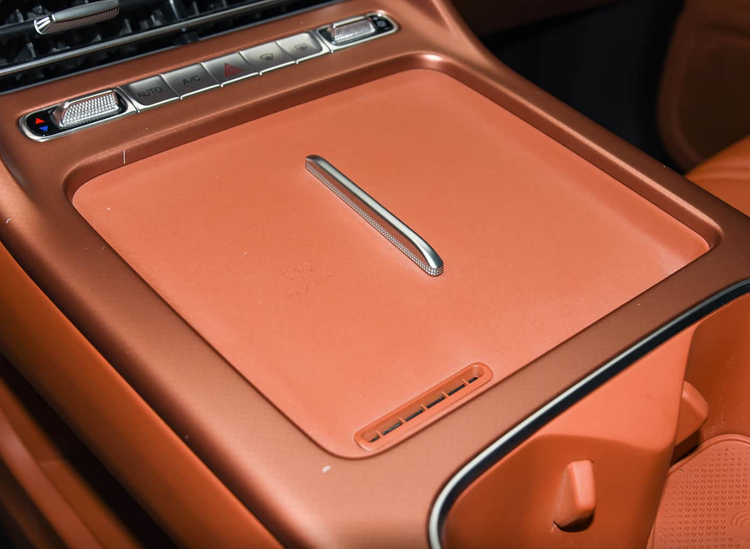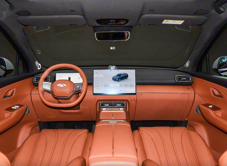 设计来到车内,内饰的设计风格还是很豪华的,因为它采用了橙色和黑色内饰的交互点缀,橙色的内饰基本上有全部的皮革包裹,摸上去的质感和看上去的既视感都很漂亮。而在配置上,这款车型将会有全液晶的仪表以及悬浮式的中控屏,中控屏为17.3英寸的2.5K高清屏幕。除此之外,它还有乐乐双出风口和无线充电面板,前排还有双零重力座椅,主驾驶有16项电动调节座椅,还有通风、加热、按摩,还有记忆、腿托、腰托的功能配置性,舒适性方面真的很难找出缺点。除此之外,它的二排座椅依旧是舒适性拉满,它二排座椅拥有35°的电动调节角度,同时也有通风加热的功能。此外,新车的前后排还可以形成双大床的模式,让整个空间的拓展性得到一个升级。不仅如此,新车还有前后排独立的观影的双视频/双音频,同时输出23个伯牙之音的扬声器,还有6~50℃的车载冷暖冰箱。