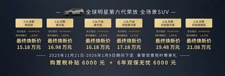 以全球第六代RAV4荣放为例,官方指导价16.98万元的2.0L双擎精英版限时焕新价仅为15.18万元。在此基础上,用户还可叠加享受6000元的购置税补贴和包含6年6次免费基础保养及6年或10万公里整车质保的“双保无忧礼”。