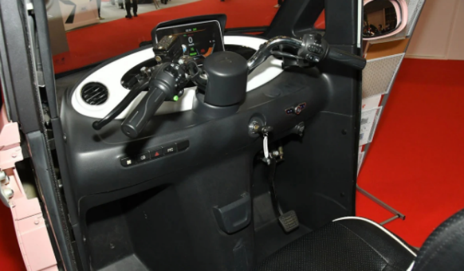 为了便于使用和满足车辆登记需求,“3RUOTA”的车长仅有2270mm,车宽1190mm,车高1570mm,尺寸上比正儿八经的Kei-Car还要小,就差单独为这台三蹦子多开通一个分类等级了。车辆内部,还是以简单实用为主,转向采用与摩托车类似的“龙头”手把式设计,中间则集成在前方的仪表台上,后刹车采用踏板式,前刹车集成在左侧手把上,和摩托车以及某些残疾人车类似。座椅布局上,位于前排的驾驶位为单座,后排为长版型双座。