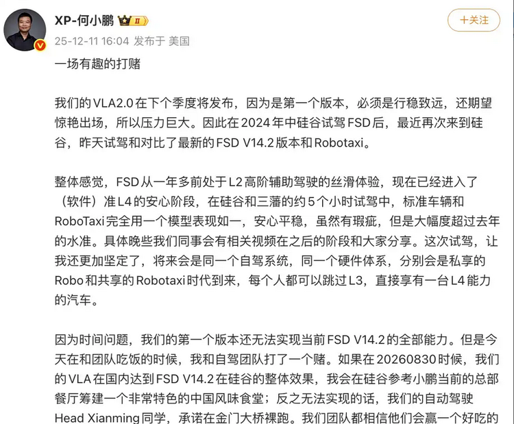 在自动驾驶行业内部,特斯拉FSD的进展也引发了同行关注。小鹏汽车董事长在公开交流中提到,他在2024年中于硅谷体验过FSD,此后再次试驾了FSD最新版本V14.2,并同步体验了Robotaxi。