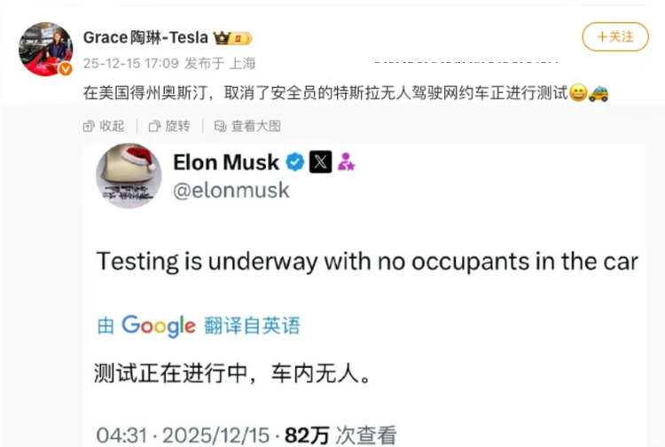 日前,特斯拉无人驾驶网约车的最新进展,正在从“技术展示”过渡到“真实道路测试”。特斯拉公司副总裁陶琳通过社交媒体转发并确认,在美国得克萨斯奥斯汀,已经有取消安全员的特斯拉无人驾驶网约车投入实际测试。这意味着车辆在公共道路环境中,不再配备主驾人员,也不再保留传统意义上的安全员,仅依赖整车感知系统、计算平台与自动驾驶软件完成行驶任务。与以往在封闭场地或限定路线内的测试不同,此次测试发生在真实城市道路体系中,涉及正常交通参与者、信号灯、非机动车及复杂路口场景。这一变化的核心意义,并不在于“是否无人”,而在于特斯拉开始用量产车硬件与统一软件模型,承担更高等级的自动驾驶责任。