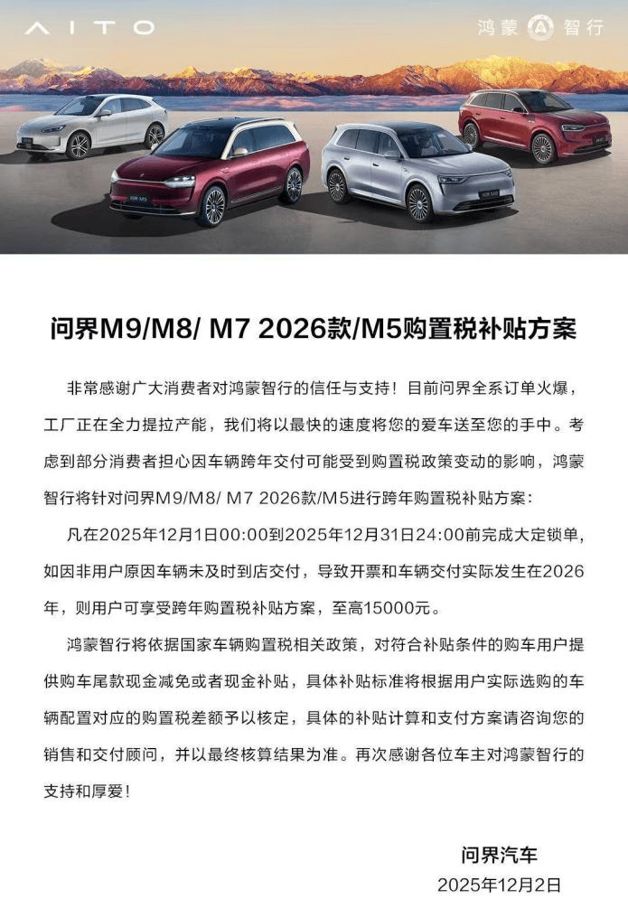 年末购车高峰期,为消除用户因政策变动产生的购车焦虑,近日,问界针对问界M9、问界M8、问界M7 2026款、问界M5推出了极具诚意的购置税补贴方案:2025年12月1日00:00至2025年12月31日24:00前完成大定锁单,如因非用户原因车辆未及时到店交付,导致开票和车辆交付实际发生在2026年,则用户可享受至高15000元购置税补贴。该补贴将以购车尾款减免或现金补贴形式发放,具体补贴标准将根据用户实际选购的车辆配置对应的购置税差额予以核定。