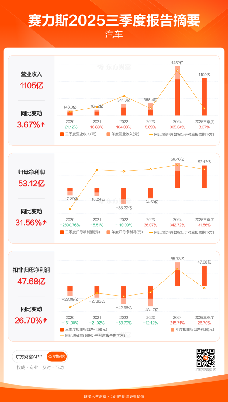 财报数据显示,2024年赛力斯归属于上市公司股东的净利润达59.46亿元,成功实现同比扭亏为盈;进入2025年,赛力斯盈利能力依旧强劲,前三季度归属于上市公司股东的净利润为53.12亿元,同比增长31.56%。