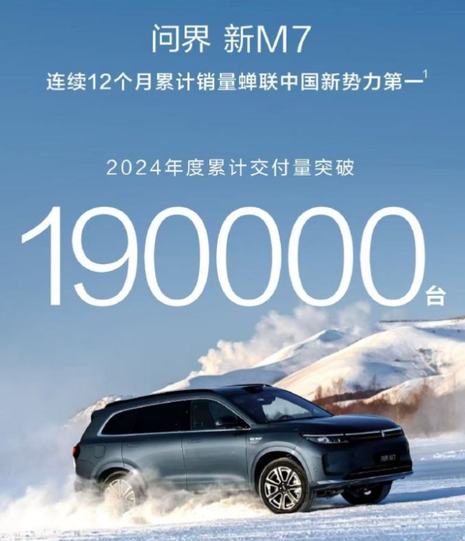 鸿蒙智行官方数据显示,2024年度问界新M7累计交付量突破19万辆。不止问界M7,定位更高的 问界M9(参数|询价)自上市以来,便长期稳居50万级车型销量冠军宝座。