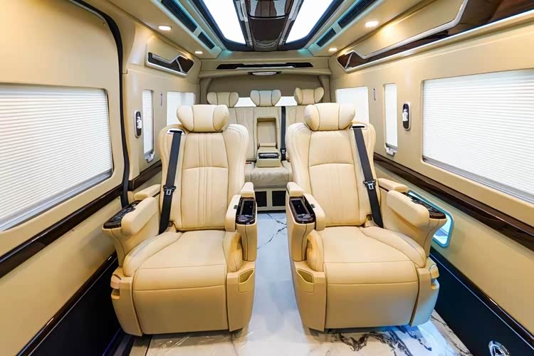 全车配备64色可调氛围灯与满天星顶灯,配合多色调节主顶灯,营造出浪漫、商务或放松的多种氛围。电动隐私窗帘、隔音材料升级、阿尔派(Alpine)高端音响系统,打造静谧私密的沉浸式空间。多功能分区设计前方设全隔断吧台区,配备热水壶、功夫茶台、净化器、衣架等。