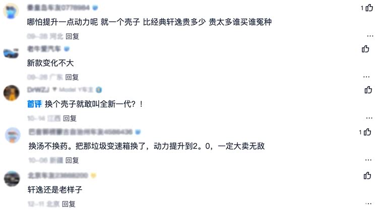 总的来说,全新轩逸的外观设计更加运动化和年轻化,但新车却依然延续现款轩逸的车身尺寸和动力。网友们纷纷吐槽全新轩逸是老款车换壳,“新瓶装旧酒”。