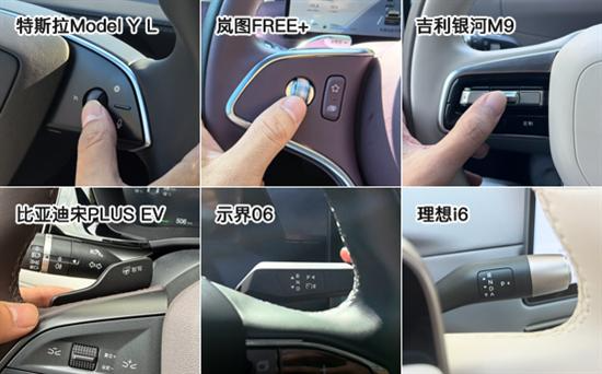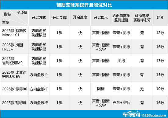 在辅助驾驶系统开启测试对比中,2025款 示界06(参数|询价)(以下简称:示界06)和2025款理想i6(以下简称:理想i6)采用方向盘拨杆开启,2025款比亚迪宋PLUS EV(以下简称:比亚迪宋PLUS EV)采用方向盘拨片开启,其余车型采用方向盘多功能按键开启。开启步骤方面,6款车型均只需1步,并且开启速度快,日常使用十分便捷。开启提示方面,2025款岚图FREE+(以下简称:岚图FREE+)和理想i6均提供三种提示方式,示界06仅提供一种提示方式,其余车型提供两种提示方式。此外,6款车型均配备方向盘离手监测提醒功能,除2025款吉利银河M9(以下简称:吉利银河M9)仅支持图标提醒外,其余车型都具备两种提醒方式。值得一提的是,岚图FREE+、吉利银河M9、比亚迪宋PLUS EV和理想i6还配备了辅助驾驶系统标志灯,能够为其他道路参与者提供明显提示。