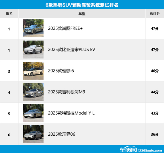 通过此次横评可以发现,岚图FREE+和比亚迪宋PLUS EV在多项测试中获得满分,总评分达到47分,排名并列第一;理想i6表现同样可圈可点,以46分的成绩紧随其后;吉利银河M9和特斯拉Model Y L虽然在部分测试环节存在丢分情况,不过两款车型的最终评分也都达到40分以上,成绩基本令人满意。至于示界06,由于在跟车状态测试中存在明显减分情况,导致其最终评分为36分,排名垫底。当然,参与横评的6款车型在辅助驾驶系统测试中或多或少都存在一些问题,希望厂家在后续的车型升级中持续优化改进,为车主带来更加安全便捷的辅助驾驶体验。