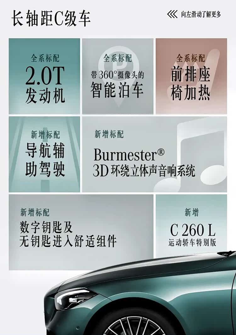 长轴距C级车,这次直接带来价值4.5万元的配置升级。全系换装M254 2.0T发动机,它把「够用」升级成「底气十足」,把「经济适用豪华」的台词改成「无需妥协的豪华体验」。全系标配可加热前排座椅及带360°摄像头的智能泊车,另外导航辅助驾驶、Burmester® 3D环绕立体声音响等配置也悉数加码,让C级的跳出「舒适区」。