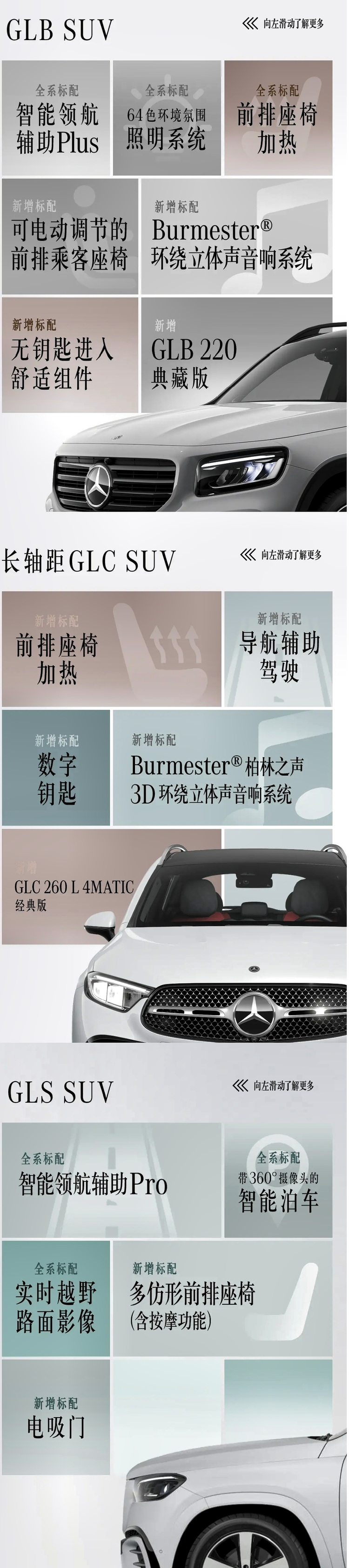 同样的体系赋能,也惠及奔驰SUV家族。从GLB全系新增标配智能领航辅助Plus和专属设计,到GLC车型在智能辅助驾驶与豪华便捷配置上的全面下放,再到旗舰GLS对全场景舒适与安全标杆的再次提升,SUV阵营的同步焕新,共同印证了奔驰对全产品矩阵智能化与舒适体验的一致性承诺。