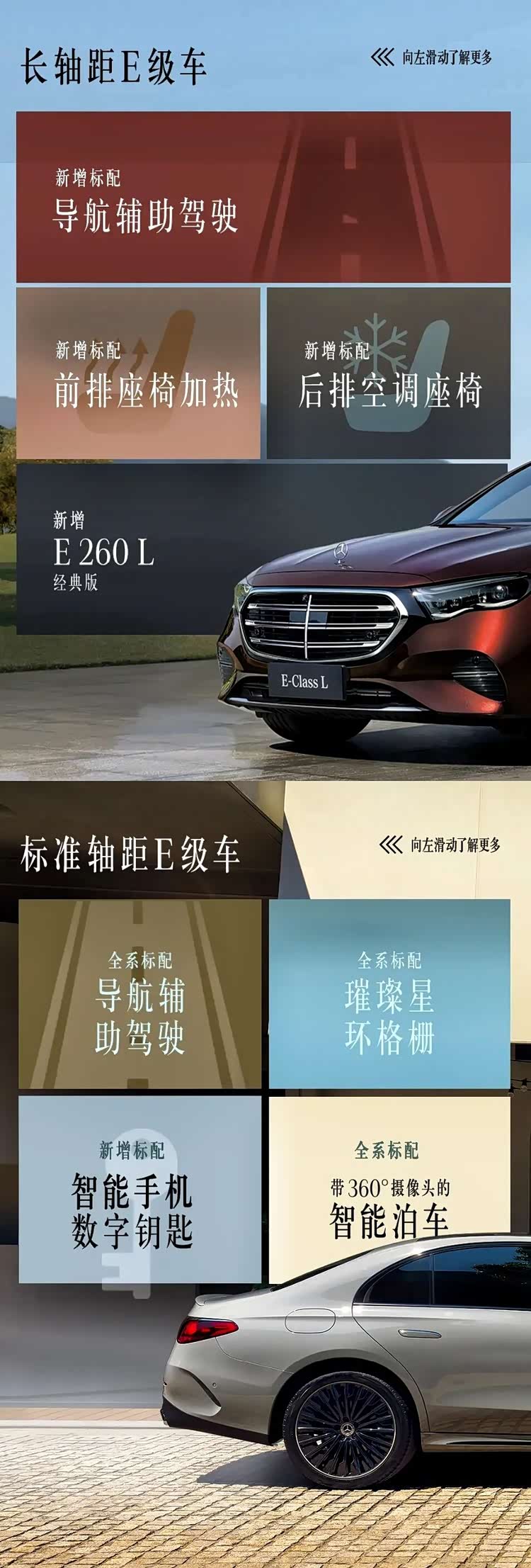 E级车家族的进化,则再一次让社会中坚心满E足。奔驰深知,叠满科技BUFF的智能座驾才是「独E无二」。从E 260 L起即标配的导航辅助驾驶,让高速城快通勤从「亲力亲为」变为从容的人车共驾。而E 300 L豪华型以上车型新增的前后排座椅加热通风,则是对中国南北气候与家庭出行场景的精准照顾。尤为重要的是,E级车全系标配的、遵循「驾控黄金标准」调校的带可调减振的敏捷操控悬挂。官方描述极为精准:「初段柔韧,过滤大部分振动;中后段扎实,提供充足支撑。」 这正是奔驰引以为傲的底盘魔法,解决了舒适与操控的天然相悖,实现了「胜似空悬」的越级质感。