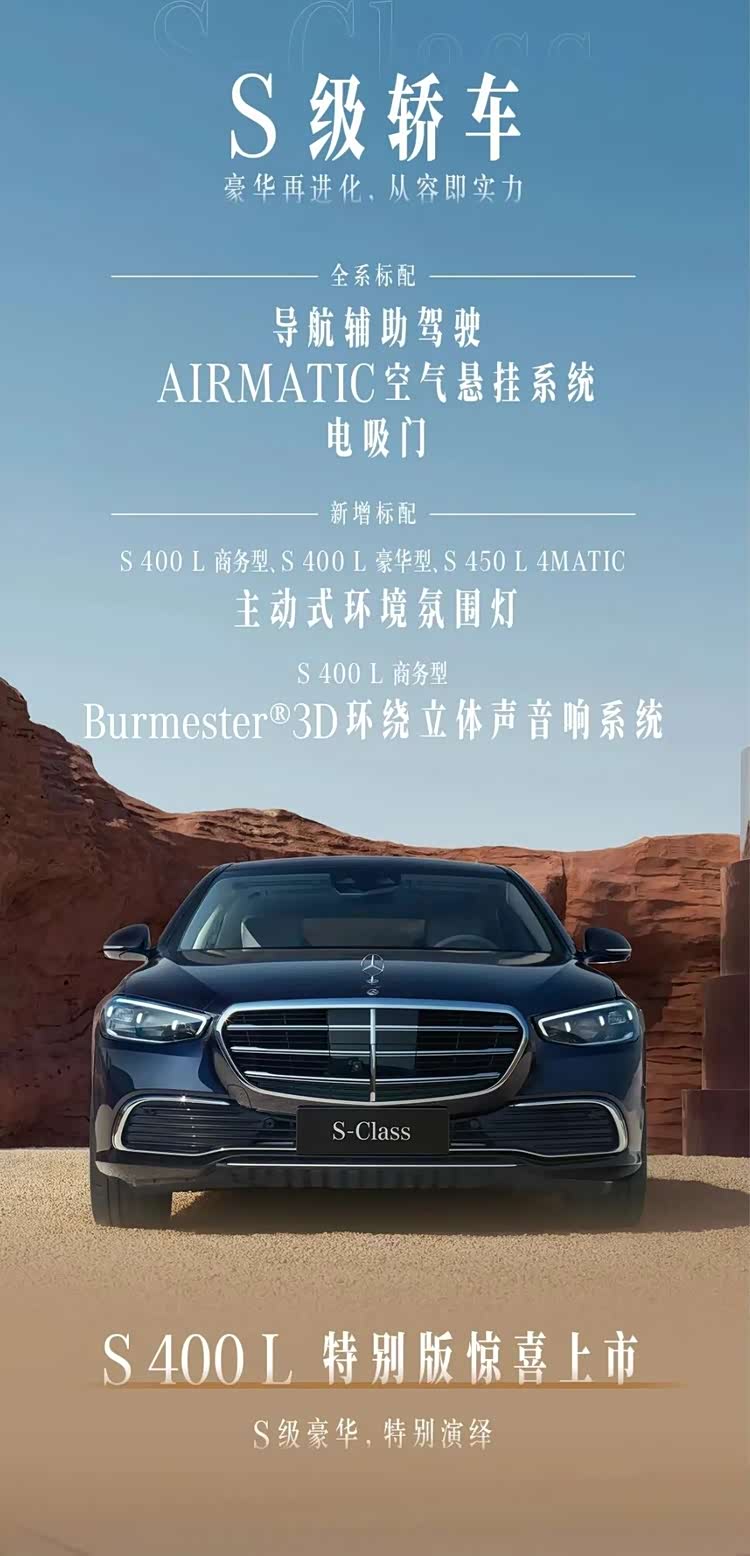 于是我们看到S级用全系标配导航辅助驾驶(覆盖全国范围高速路段与城市快速路段)、空气悬挂系统和电吸门,来定义「智享升级,焕新体验」。