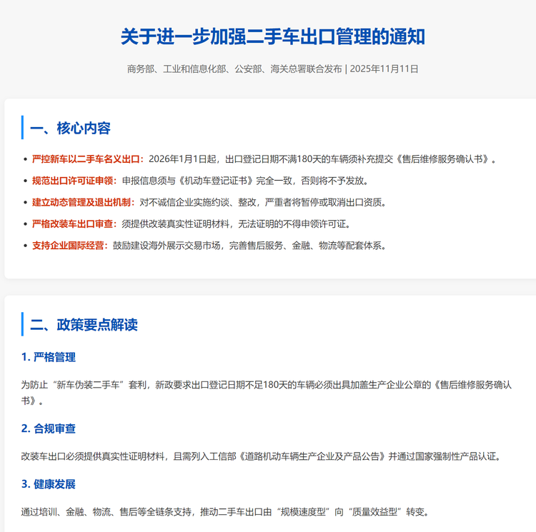 值得注意的是,一方面,海关总署联合相关部门推出了多种创新监管模式和流程简化举措,覆盖新车、二手车等不同品类,旨在缩短通关时间,降低了企业物流成本;另一方面,11 月,多部门发布的《关于进一步加强二手车出口管理工作的通知》,明确严控新车以二手车名义出口。