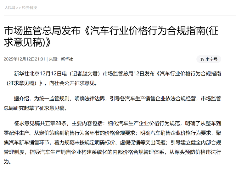 但12月12日,市场监管总局《汽车行业价格行为合规指南(征求意见稿)》剑指 “低价倾销”,明确禁止 “除清仓外以低于成本定价”,甚至要求车企建立价格合规审核机制,对厂家、商家以及配套供应商均有相关约束说明。