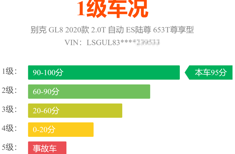 关于这个分值,我觉得有必要和大家科普一下,大家真的不要以为95分就感觉很了不起,可能很多人以为95分属于准新,其实并不是这样的,他这个是按照国标来扣的分,就算是整个车的外观全都有修复全车钣金这种,最多最多也就扣二十分,这样说大家能明白吗?