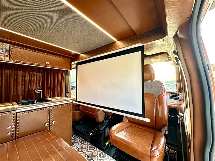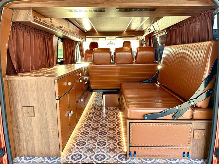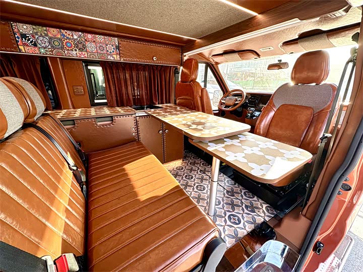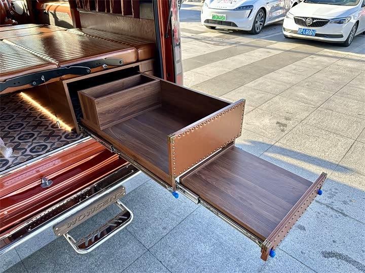 整车标配的有8度电,以及50升的水箱,还有个3千瓦的逆变器,进入到车内饰里面去,整体的油蜡皮的包覆,复古的印花纹的地板,内饰的色彩和外观的颜色相搭配的非常的好。整车整体也做了软包,质感瞬间就提升了。要说到车里面的配置,首先它是一个带边柜板的一个布局,最左侧整体的一排柜子,能够满足日常出行的各种储物,而且还有单独的车载冰箱以及小厨宝,带翻盖板的洗水槽,这些生活便捷设施。而且检测的左边的操作台也可以当做我们日常的工作台来使用,如果有自由工作者的朋友,开上这样一款小车,来到公园旷野的旁边进行办公,也是非常惬意的一件事情。
