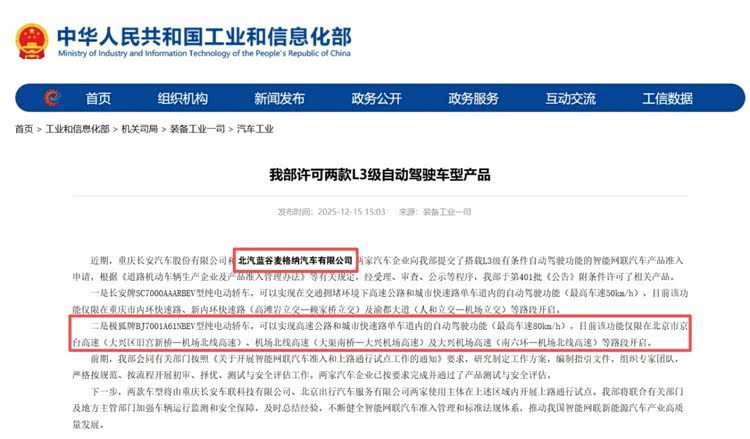 12 月 15 日,工信部公布首批L3级有条件自动驾驶车型产品准入许可。在这一历史性节点上,北汽新能源和长安汽车成为率先站到起跑线前的车企。其中,长安汽车获批的深蓝SL03车型最高车速为50km/h,适用于重庆市的特定快速路段;而北汽新能源的极狐阿尔法S(L3版)则可在北京的特定路段实现最高80km/h的自动驾驶。并即将在北京限定区域内开启上路试运行。