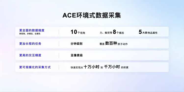 ACE范式核心技术之一环境式数据采集技术,通过跨视角多模态设备,融合视觉、触觉、语音、力学规律等多维度数据,物理级建模与全场景覆盖的创新设计,为具身智能模型训练提供 “人—物—场”全要素精准数据支撑。