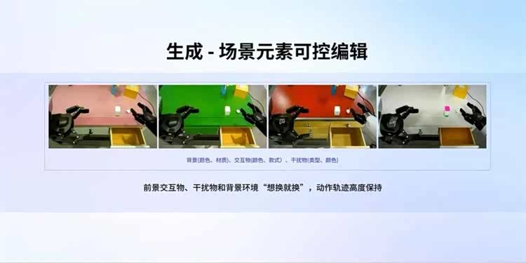 基于多模态信息的深度融合,模型可生成长时动态交互场景视频,在场景内实现各元素精准可控;并具备跨本体一键生成、多本体泛化、预测万千演化路径等特性,为具身智能提供高保真、可泛化的虚拟训练环境。