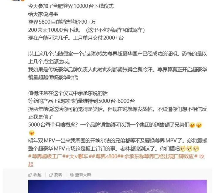 博主还分享了华为常务董事、产品投资评审委员会主任、终端 BG 董事长余承东的讲话。其中提到,尊界新产品上线要把销量维持到 5000-6000 台。博主进行了类比,尊界 5000 台每个月,相当于一个品牌销售额可以顶一个集团的销售额。