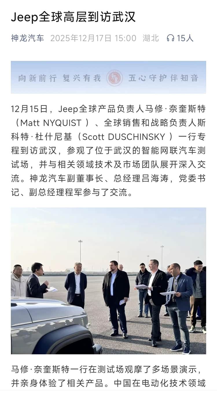 神龙汽车官方微信12月17日发布的一篇文章透露,Jeep全球产品负责人马修·奈奎斯特、全球销售和战略负责人斯科特·杜什尼基一行刚刚专程到访武汉,而接待的正好是神龙汽车的领导班子。