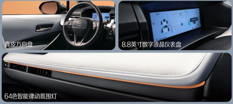 变化较大的是内饰,雷凌L采用全新的设计风格,官图呈现的是传统的黑白配色,空调出风口采用贯穿式样式,并引入64色律动氛围灯,升级搭载全新的8.8英寸数字液晶仪表盘以及12.9英寸中控屏,内置8155P车规级芯片,支持HUAWEI HiCar 5.0、Carlink互联。此外,中控台下方还配有50W无线充电。