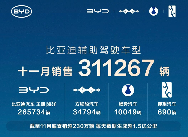 官方数据显示,比亚迪辅助驾驶车型截至11月底已累计售出超230万辆,每天数据生成超1.5亿公里。