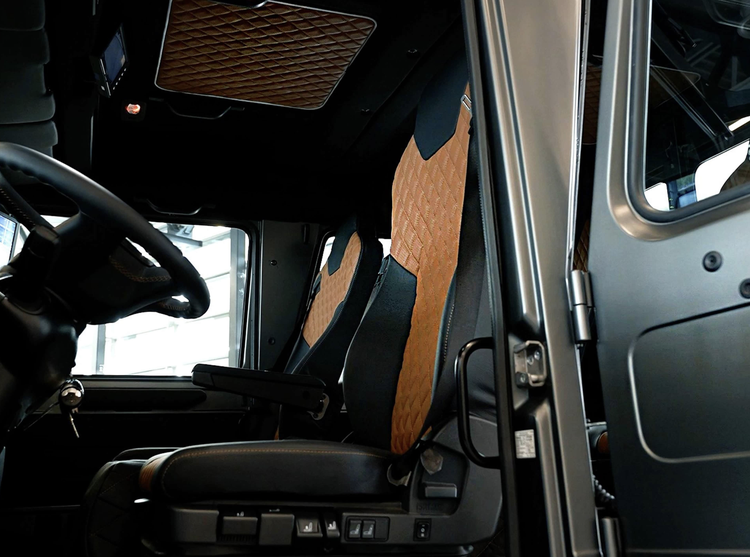 核心部分,乌尼莫克U4030搭载了全新的7.7T涡轮增压六缸柴油发动机,最大输出功率达到了300匹马力,峰值扭矩将超过1000N·m,将提供更强的牵引力和更平顺的传动表现。该车采用了全时四驱系统,还保留了三把差速锁等一些列硬核越野配置。整车为了追求极致轻量化与强度,一些定制车型采用全碳纤维结构(包括车身和内饰部件),结合芳纶蜂窝夹层技术,实现高比强度与耐腐蚀性,同时保留门式车桥、扭转柔性车架等经典越野设计,提升通过性。