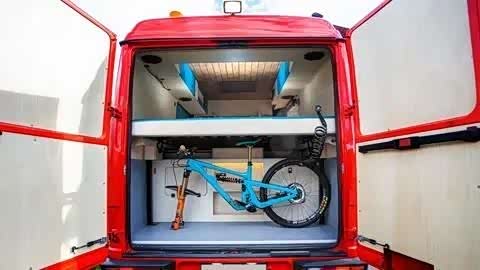 车辆前端配备了绞盘,顶部装有醒目的探照灯和警示灯,结合醒目的红色车身,行驶时极为显眼。打开尾部的对开门,一张横置的大床映入眼帘,床下空间宽敞,可以轻松容纳自行车或其他大型物品。
