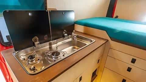厨房位于车门入口处,设计有一体式双眼燃气灶和洗菜盆的橱柜,下方则设有隐蔽式冰箱。此外,车内还配备了100升的清水箱和30升的灰水箱,以及柴油驻车加热器和燃气热水器等便利设施。