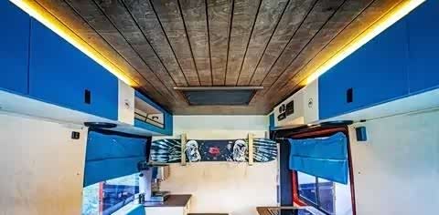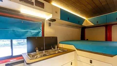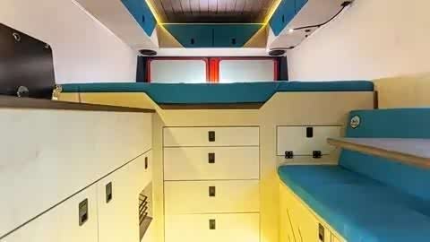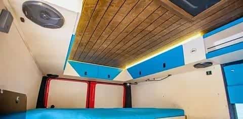 车内设计简洁,前部设有厨房和座椅,后部是一张宽敞的大床,尺寸达到1.8米宽、2米长。全车内饰以蓝色为主调,同时运用实木板材覆盖车顶,营造出户外旅行的氛围。这种颜色搭配使整车更显年轻活力。