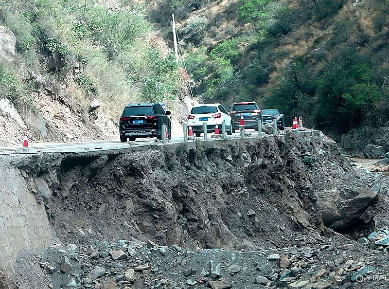 这条山沟叫海通沟,其实早就铺好了柏油,由于雨水,路面时有破损。2014年和2015年两次走到这里,都很顺利通过,可2012年9月途经此处,因泥石流堵了8个小时。同行者在堵点看到,有辆普拉多过塌方点时,驾车人不听建议,一副满不在乎的表情,结果陷住了。旁人只得用拖绳拖,单单他一辆车,就折腾半个小时。我身后有辆北京牌照的轿车,车上是4位大叔。人家看我开的是越野车,跑来请我通过塌方点之后,等一会,如果他的车过不去,请我拖一下。但是,人家顺利通过了。